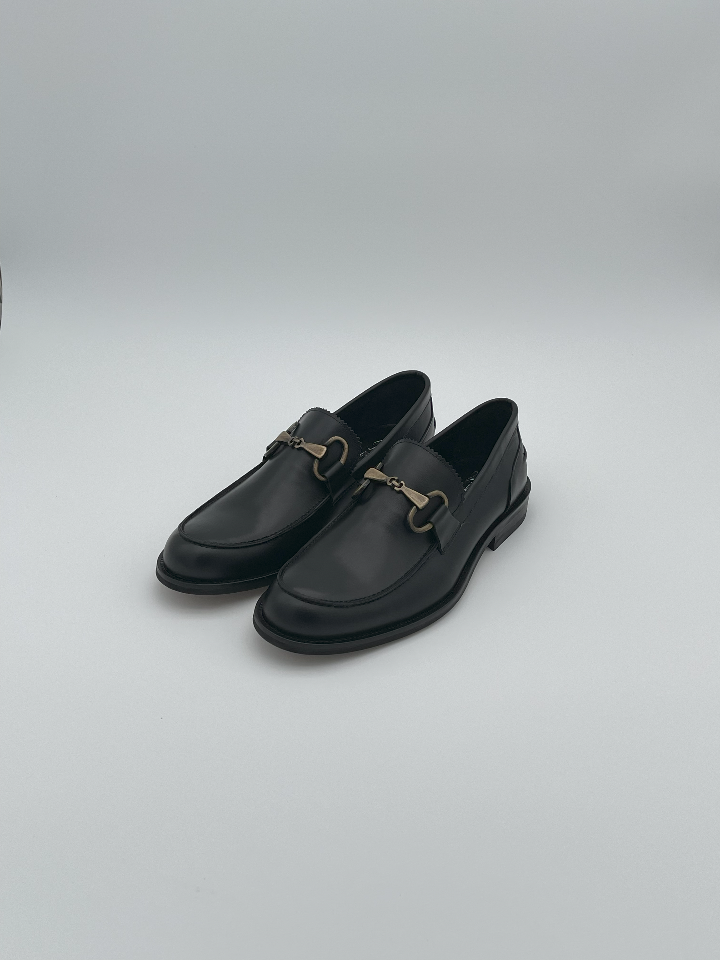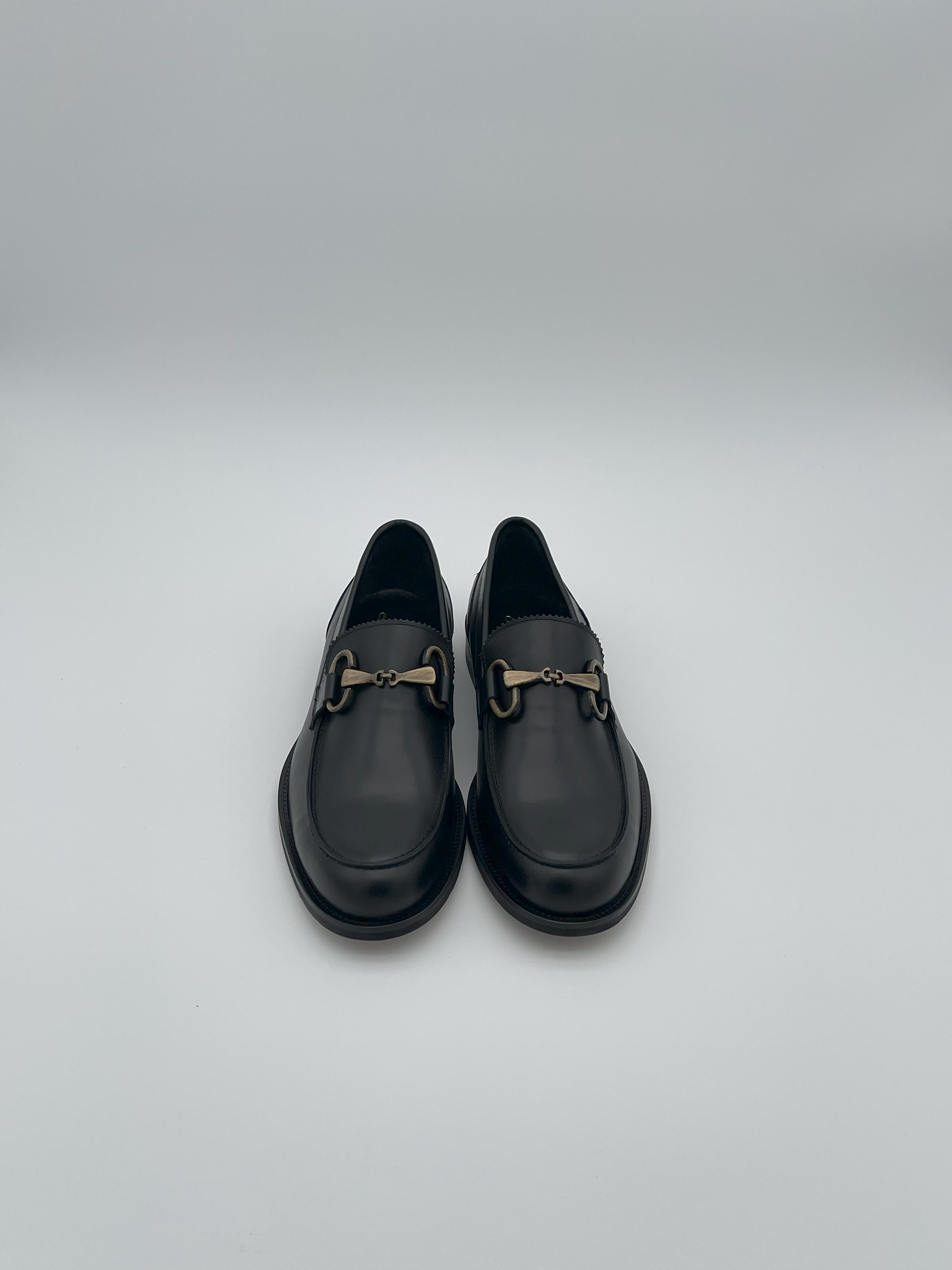 Loafers are crafted from black leather, ensuring a sleek and polished appearance. They are decorated with bronze hardware, which adds a touch of elegance and sophistication to the overall design.